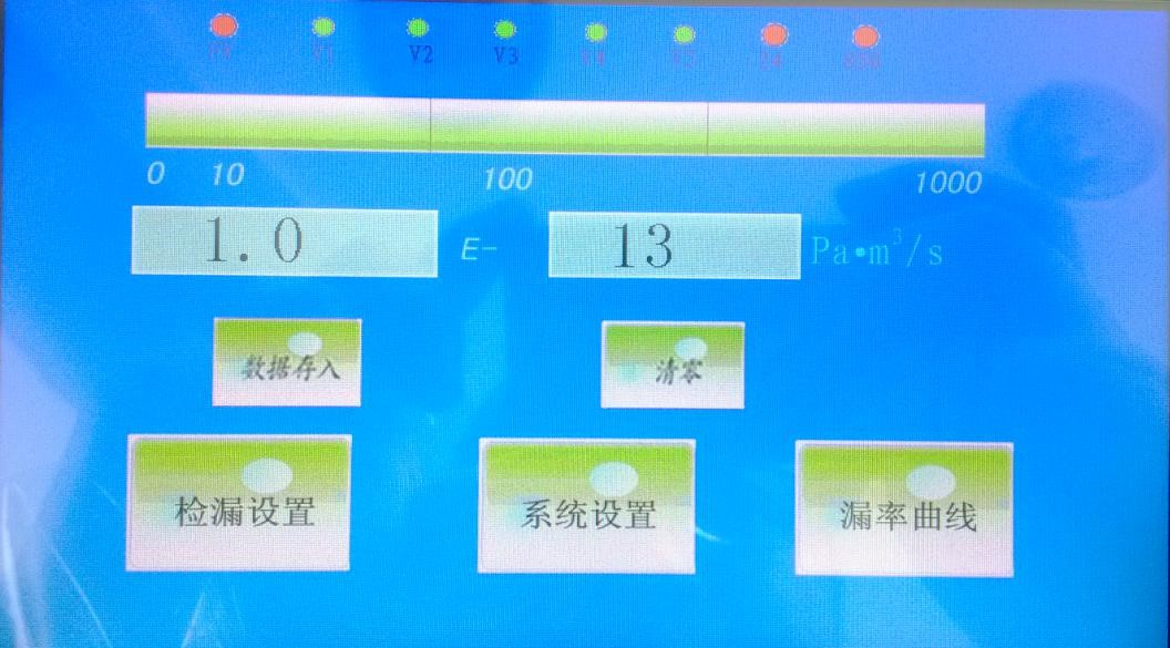 1、在按下“檢漏”鍵之后,檢漏儀主界面顯示當前各個電磁閥狀態和漏率實時數據。
